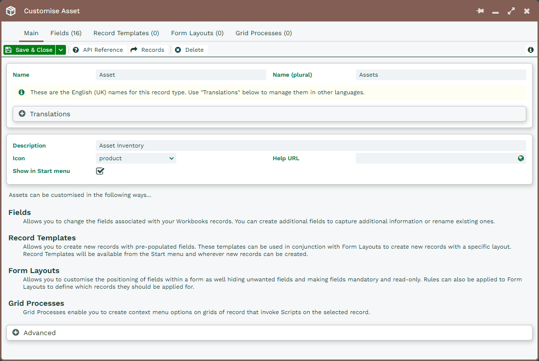 From here most of the settings used when creating the Custom Record Type can be edited to change how the Record Type is viewed within Workbooks.
