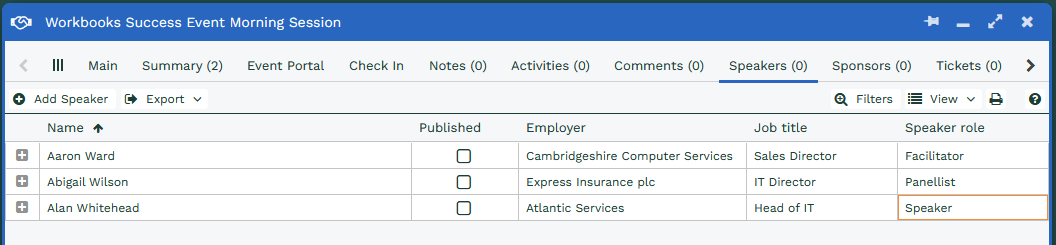 You are able to provide information about Speakers at your Event to this tab within Workbooks, this is then shown in the Event Portal. Additional information can be added to the Speakers to provide attendees with more information as to who they are and why they are speaking.