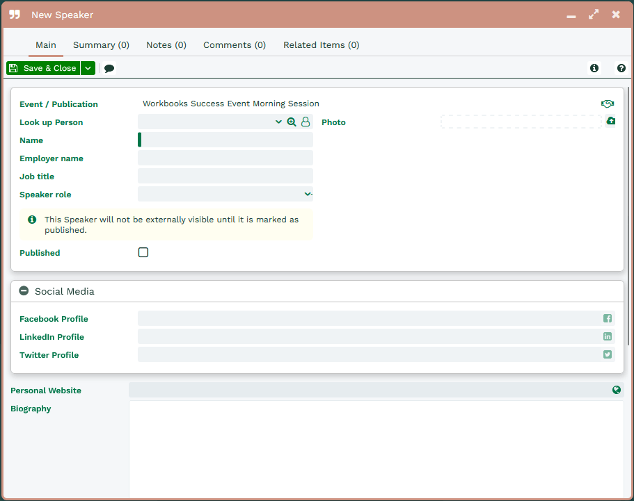 Look up Person: If the Speaker exists within Workbooks you are able to search for them in the Look up Person field, this will then populate information on the Speaker Record that is already on their Person Record.