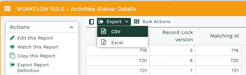 Reports can be exported from Workbooks into eitherĀ an Excel or CSV format.