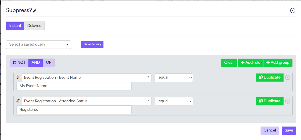 On the “Suppress?” and “Registered?” blocks, amend the criteria to be