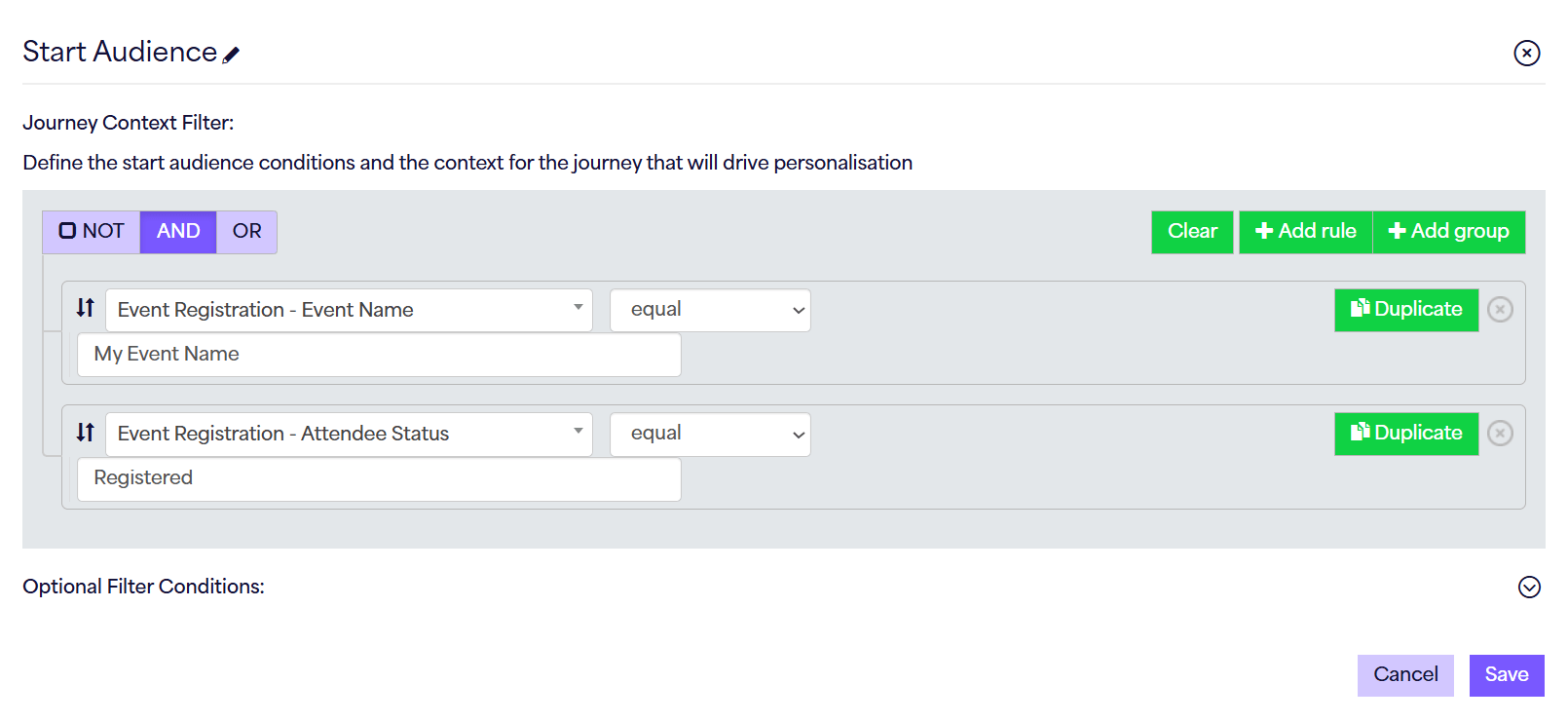 You would like to send people through a journey to invite them to your event, sending invite reminders in the build up to the event. You would like anyone that has registered to automatically come out of the Journey.