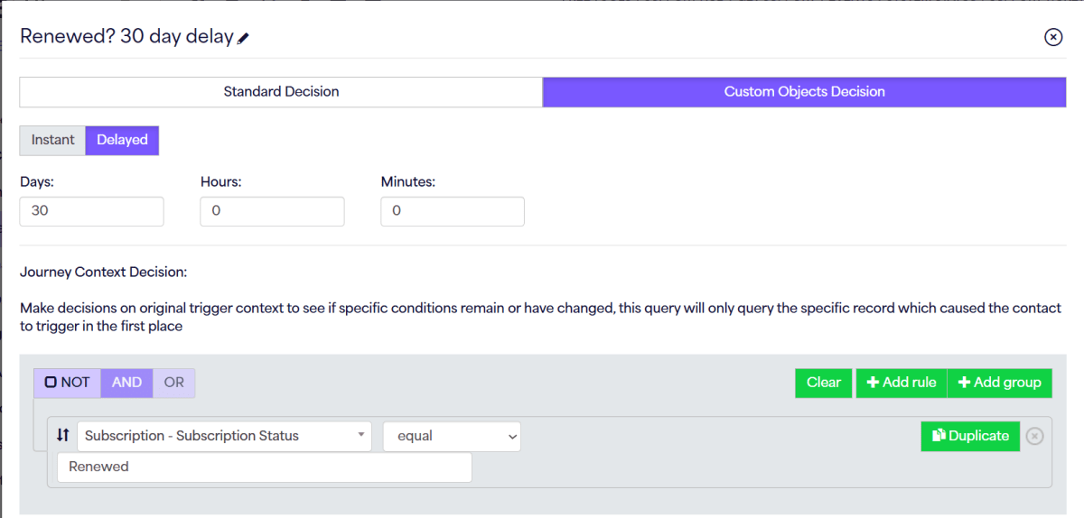 Create a new Journey from a template, using the ‘Renewal Journey’ template, and set Journey Type to be ‘Custom Object’ and Custom Object Selection to be ‘Subscriptions’.