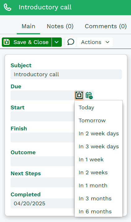Relative dates have already been set up on Activities for the Due Date, Completed date, Reminder Date and Next Due fields but you can modify the options available if you want a different selection from the ones we’ve set up. In addition, if you want to use the date picker elsewhere in the system you can modify the date field on the form layout, as described below.