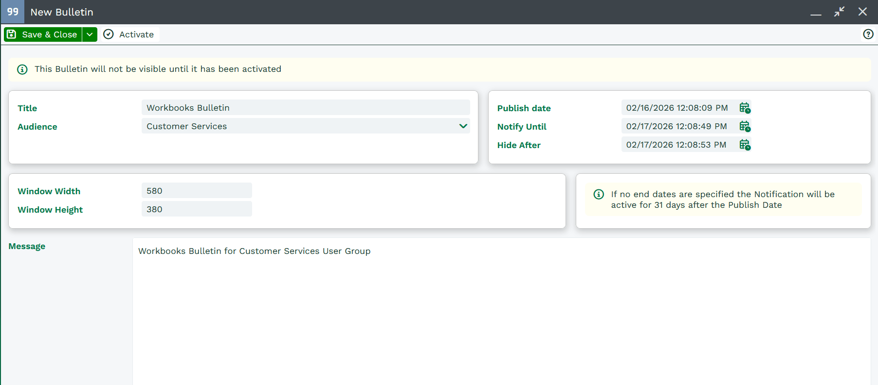 When you’ve completed your message you can click Save & Close. Remember to click Activate to make it visible to your specified audience.