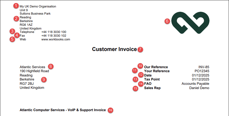 13. Only displayed on Invoices or Credit Notes, and only if the ‘Tax_Point_Date’ PDF Setting Label is not blank. Uses the Label from the ‘Tax_Point_Date’ PDF Setting. Value is pulled from the ‘Tax point date’ field, displayed in the Date Format specified in the ‘Date_Format’ PDF Setting.