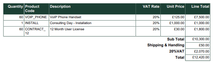 • VAT – The Label pulls from the ‘VAT’ PDF Setting, concatenated with the Tax Rate Percent. On an Invoice or Credit Note, if more than one Tax Code is applied across the line items, a separate row will be shown per Tax Rate Percent applied, with the label in the format of ‘X% VAT of Y”, where Y is the Total Net of the Lines that Tax Rate Percent applies to. Otherwise, the VAT row only shows when the ‘VAT’ PDF Setting Label is not blank, and when the Own Organisation VAT Number is not blank.