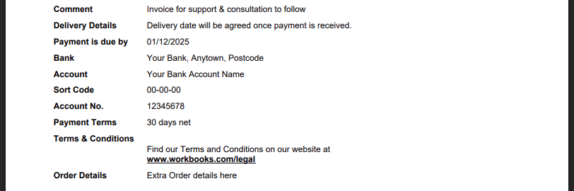 • Sort Code – The Label and Value pull from the ‘Bank_Account_Sort_Code’ PDF Setting. Only shows on Invoices, if the ‘Bank_Account_Sort_Code’ Label and Value are not blank.