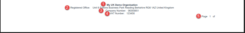 2. The Label is pulled from the ‘Registered_Office’ PDF Setting, or defaults to ‘Registered Office’ if the Setting is blank. If the Value of the PDF Setting is left as @own_registered_office@, then the address will pull from your Own Organisation record. Change the field on your Own Organisation, or overwrite the Value to fix it to something else. This row only shows if the ‘Registered_Office:’ PDF Setting Value is not blank.