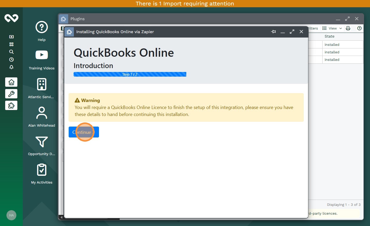 8. Before clicking “Continue” for this integration, confirm that you have a System Administration login for QuickBooks Online. Once you have these credentials to hand, click Continue on Step 1 of the Plugin