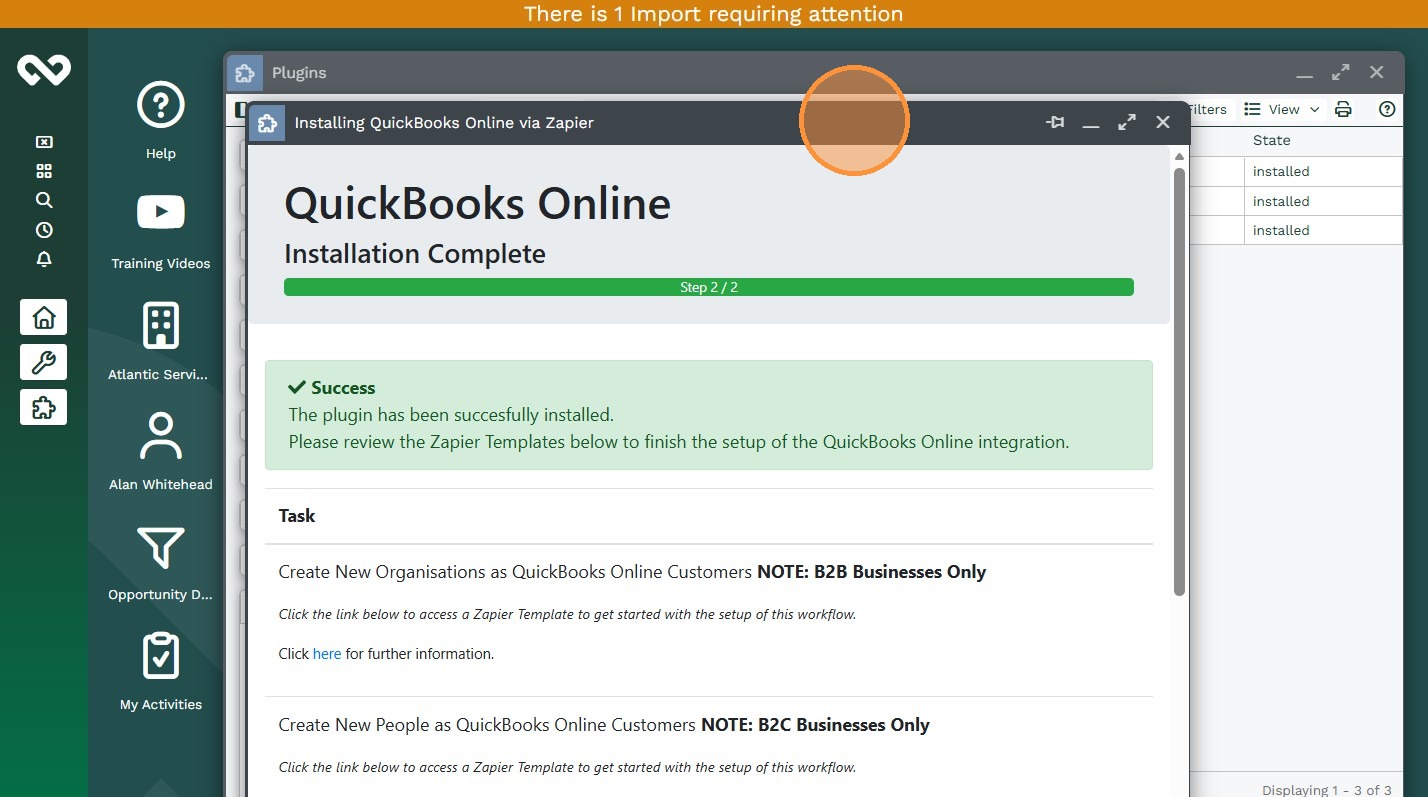 - QuickBooks Listener: This process listens for QuickBooks Payments passed to Workbooks via Zapier. When a payment is received, the relevant Workbooks Invoice “Amount Paid” field is updated with the value of the QuickBooks Payment. The Payment also appears as a Workbooks Task, available under the “Activities” tab of the Invoice.