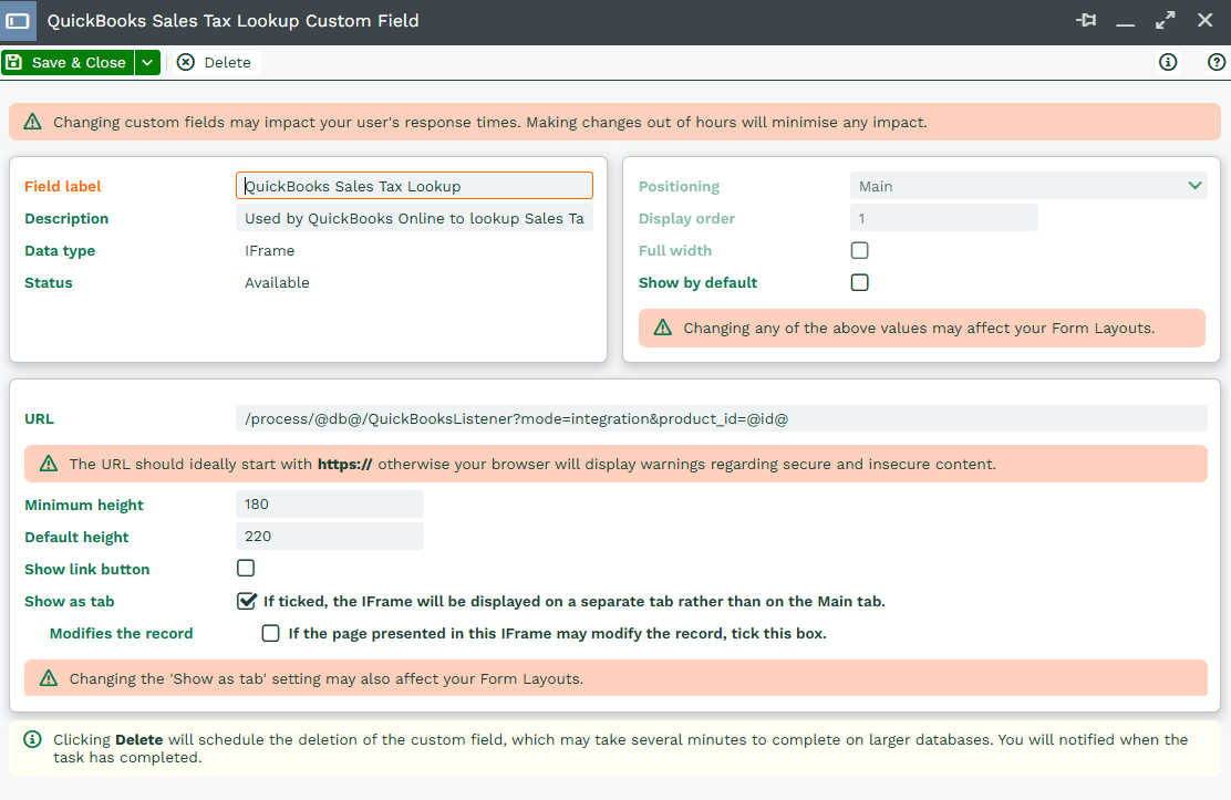If set, that Sales Tax Code will pull through to any Transaction Document Line Item where that Product is used. Navigate to Configuration > Customisation > Products > Fields tab to find the field. The Custom Field is created with the following two settings set to FALSE.