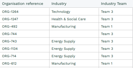 When an Organisation has an industry of ‘Manufacturing’ output ‘Team 1’ if it is ‘Education’ output ‘Team 2’ otherwise output ‘Team 3’