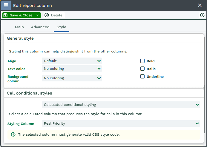 You can now apply this to the “style tab” of the column previously created in example 2 as “Calculated conditional styling” (CSS).