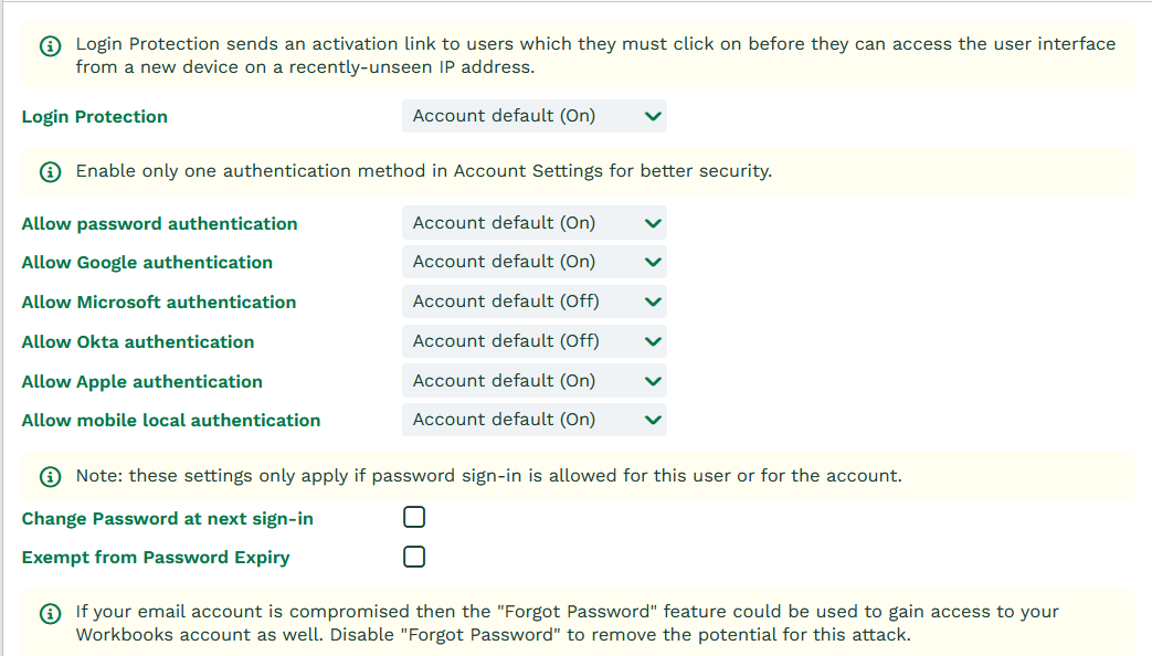 This means that even if someone has obtained one of your users Workbooks password and attempted to login from their device or IP address that they are using, they will still not be able to access the Workbooks account, because the User is actually logging in through their Google Account. As such, once this setting is active a user can only log into Workbooks using the Google button