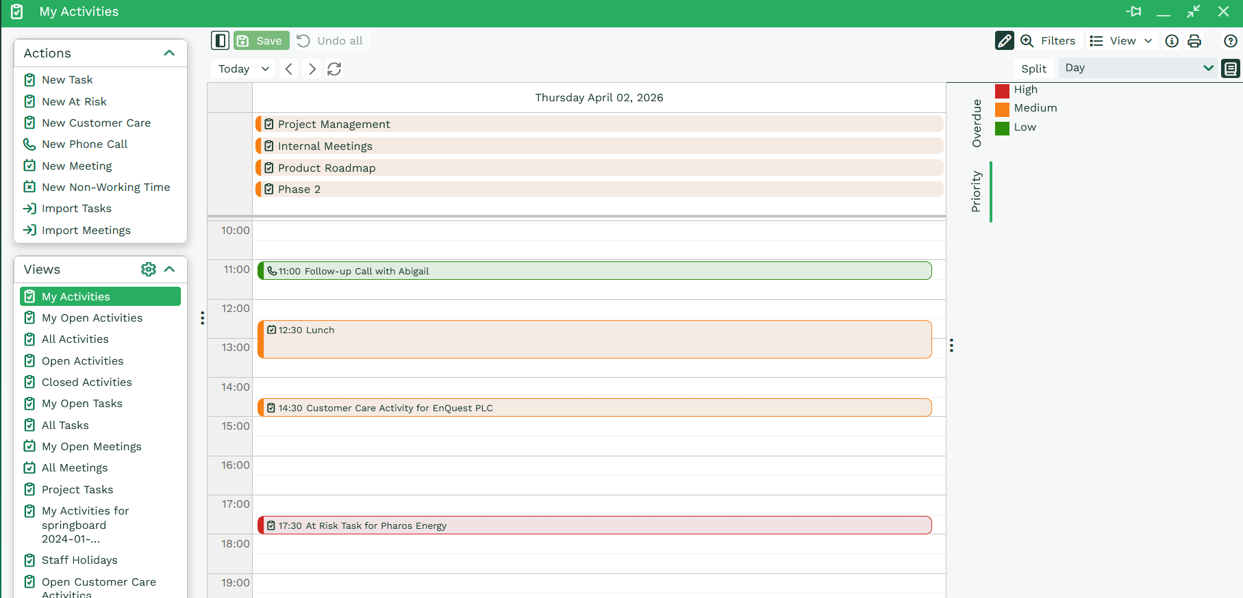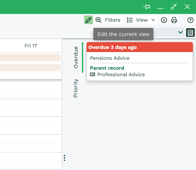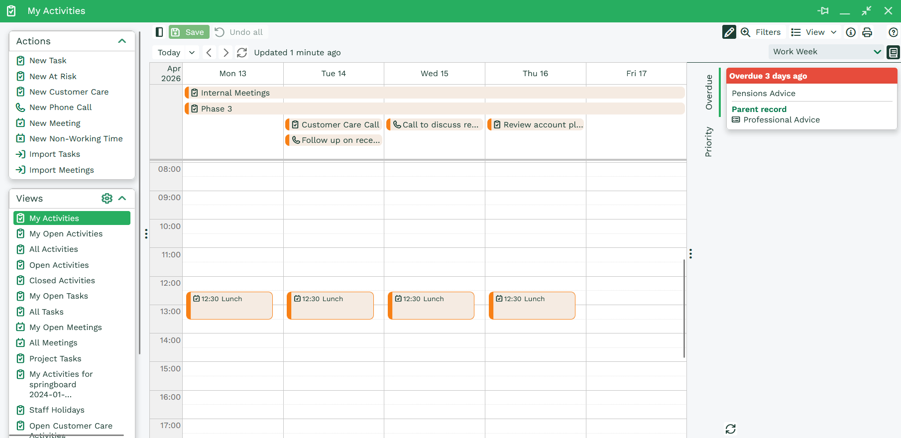 Schedule View allows you to quickly set dates or times in which Activities can take place through drag and drop. Simply ensure the View is in edit mode and drag a Task or Meeting into a time slot on the Calendar. Activities can be moved between dates but be aware that this will change the Due Date on the underlying record. Ensure that you save the changes you’ve made to make them permanent.