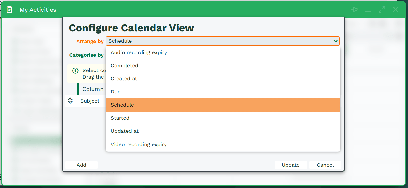 By default, unless another view has been saved, the Activities Landing Page will open in ‘Schedule View’. If you have a View saved and would like to switch to Schedule View, simply navigate to the ‘Configure View’ menu and set ‘Arrange by’ to ‘Schedule’. Schedule View opens in edit mode and allows you to quickly and easily create, schedule and reschedule Activities from a combined view.