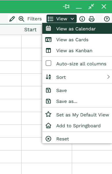 Switching from a grid view to the calendar view is easy. Click View on the top right of the Landing Page or Report then select View as Calendar.