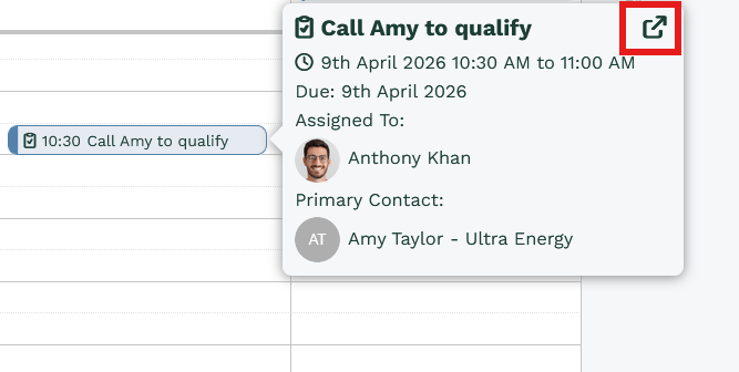 Mousing over an Activity in the Calendar will reveal additional information from the underlying record. The information that is presented can be customised and fields can be added or removed depending on user preference. To open a record from the Calendar, click on the icon in the top right on the information box.