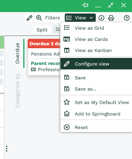 The Calendar View can be further customised via the ‘Configure View’ menu. To access the Menu, navigate to the ‘View‘ dropdown menu at the top right of the page and select ‘Configure View‘