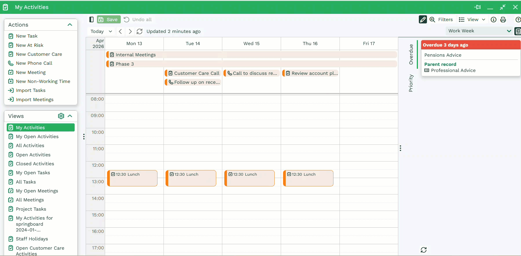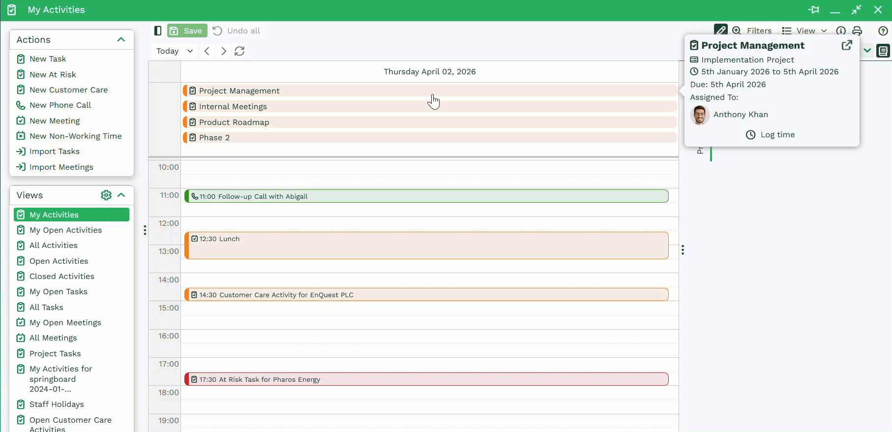 Schedule View allows you to quickly set dates or times in which Activities can take place through drag and drop. Simply ensure the View is in edit mode and drag a Task or Meeting into a time slot on the Calendar. Activities can be moved between dates but be aware that this will change the Due Date on the underlying record. Ensure that you save the changes you’ve made to make them permanent.