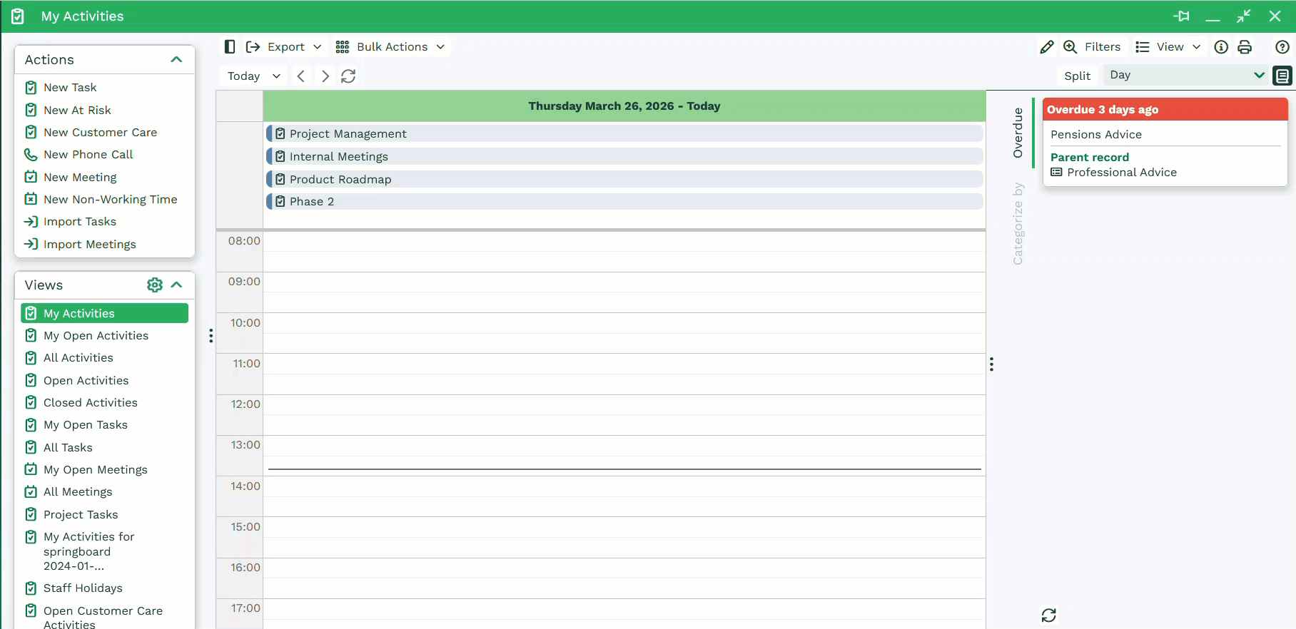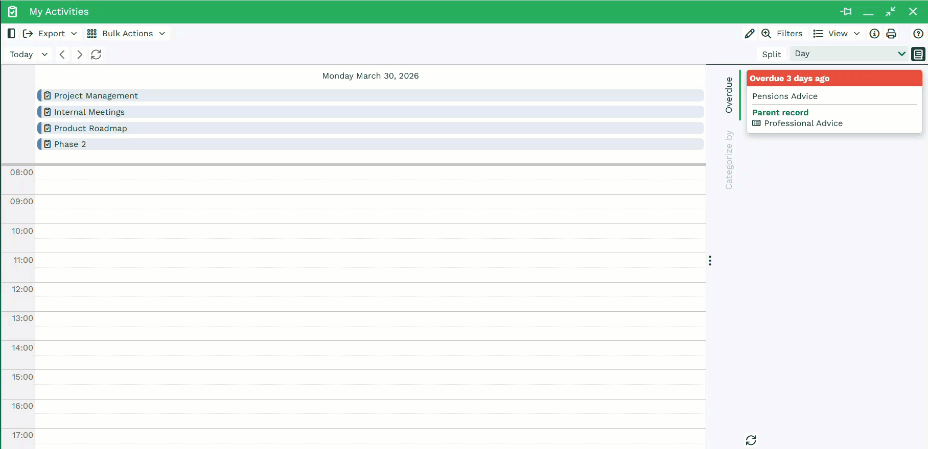Within the Week or Day view, you will see an hour by hour breakdown of your records. This is particularly useful when arranging meetings, as the view allows you to see your availability quickly.