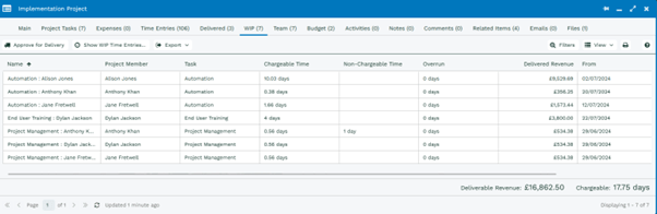 At the bottom you can see the total amount of Chargeable time and the Deliverable Revenue. If your Project it ‘Rate Only’ you would not see Chargeable time.