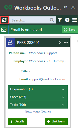 If you want to then clear the search results and return to the Contact Cards of the email you are viewing pressing the refresh button will remove all of the search results and return you to the default view.