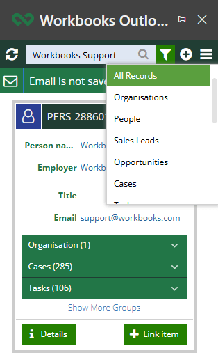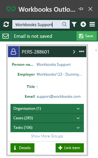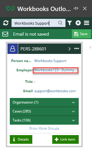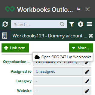 This will open an Organisation Form that shows a summary of the information that is held within Workbooks. From this form not only are you able to review information such as the contact details, but you can also make amendments within Outlook that will update the Organisation Record directly in Workbooks.