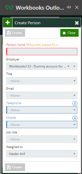 Selecting New Person will open a create person form, where the Employer will be automatically set to the Organisation that this was generated from. In addition to this Field you will also need to ensure that the Person name, Email and Assigned to fields are populated.