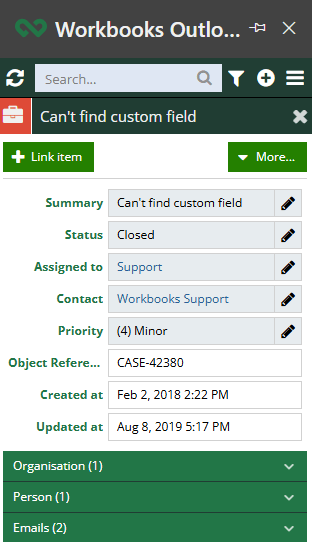 It is also possible to review details of the Record within Outlook, by selecting the Summary this will open the details of the Case that are accessible to the Add-in. All Record types can be updated and edited from within the WESS Add-in providing that there is a pencil icon next to the Field.