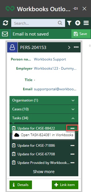 To open a record in Workbooks select the ellipsis (…), this will open a new menu and give you the ability to open the record directly in Workbooks.