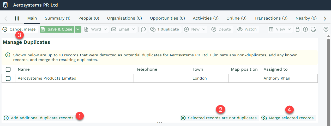 If you have duplicate records in your database, you can merge them together. Only People or Organisation records can be merged together, and only up to 5 records can be merged at a time.