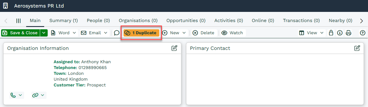 Users with the Merge Duplicate Records capability will see a Merge button at the top of People and Organisation records. As shown below, when Workbooks finds a duplicate, the button will change to orange and it will indicate the number of duplicates that have been found.