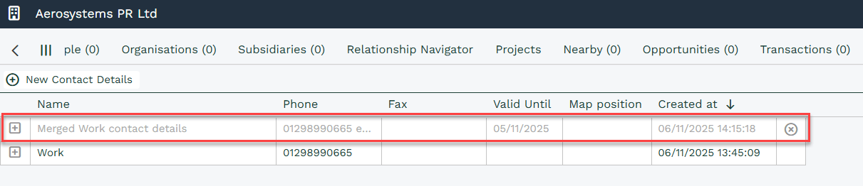 The Contact Details tab of the record will now show a greyed out row for the previous Main Location Contact Details for each of the records you just merged together.