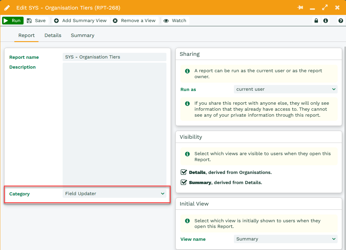 - Ensure that the Report is in the ‘Field Updater’ Category which can be amended in the Report tab of the Report. If your ‘Category’ Picklist doesn’t contain ‘Field Updater’ you can simply type this in as shown in below.