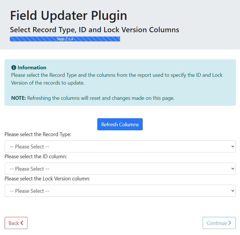 The next step is to identify which record type you’d like to update with this process, and in the next two dropdowns you’ll need to select the column from the report that refers to the record’s Id and Lock Version.