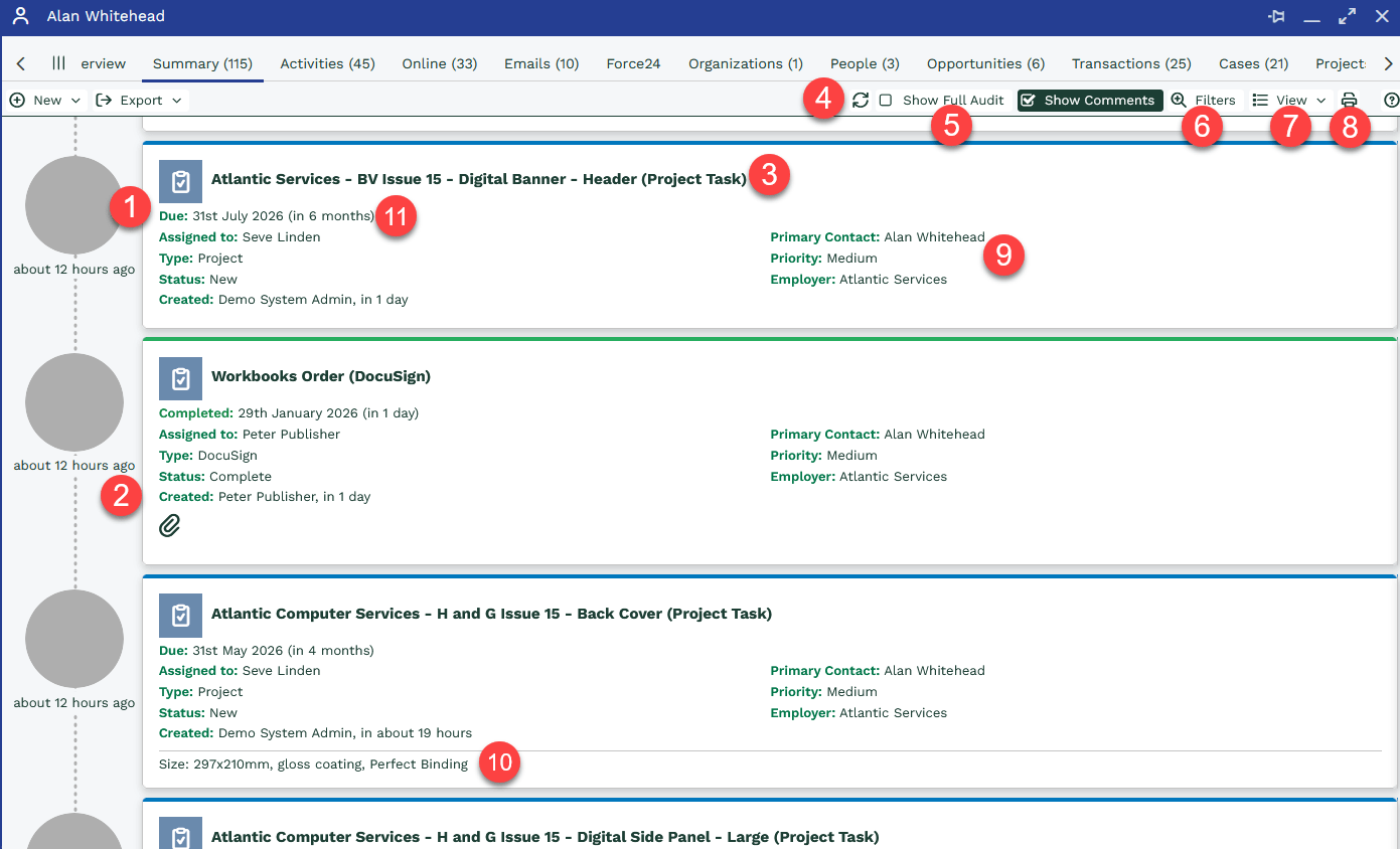 The Summary tab is available on all records is a great way to see an overview of interactions with that record. In it you can see all the Activities, Emails, Notes and Transactions linked to the main record as well as Online Activities and Audit records.