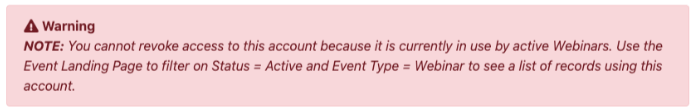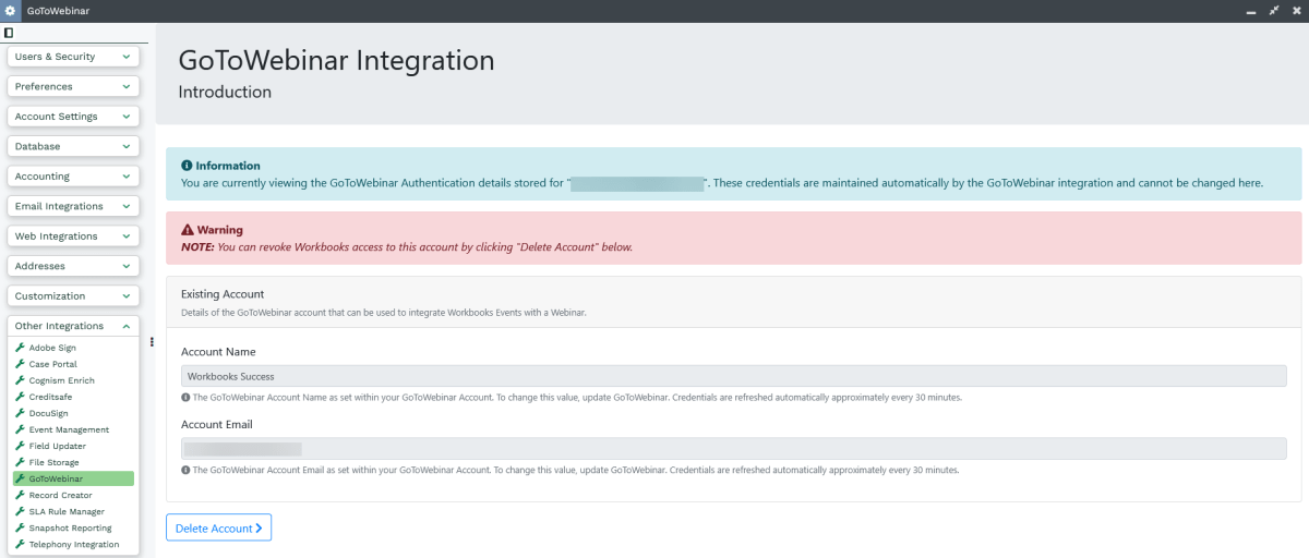 If there are Events relating to this GoToWebinar account that are still active within your Workbooks system, you will be unable to remove the account until they are completed.