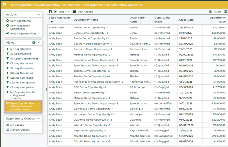 A Landing Page View displays columns from a single record type e.g. Opportunities. They don’t allow you to “drill through” to information related to the Opportunity, such as the Prospective Customer’s Country. This is fine if you’re just interested in information on the Opportunity header record itself, but reports offer more advanced functionality, such as the ability to report on linked records and add advanced criteria.