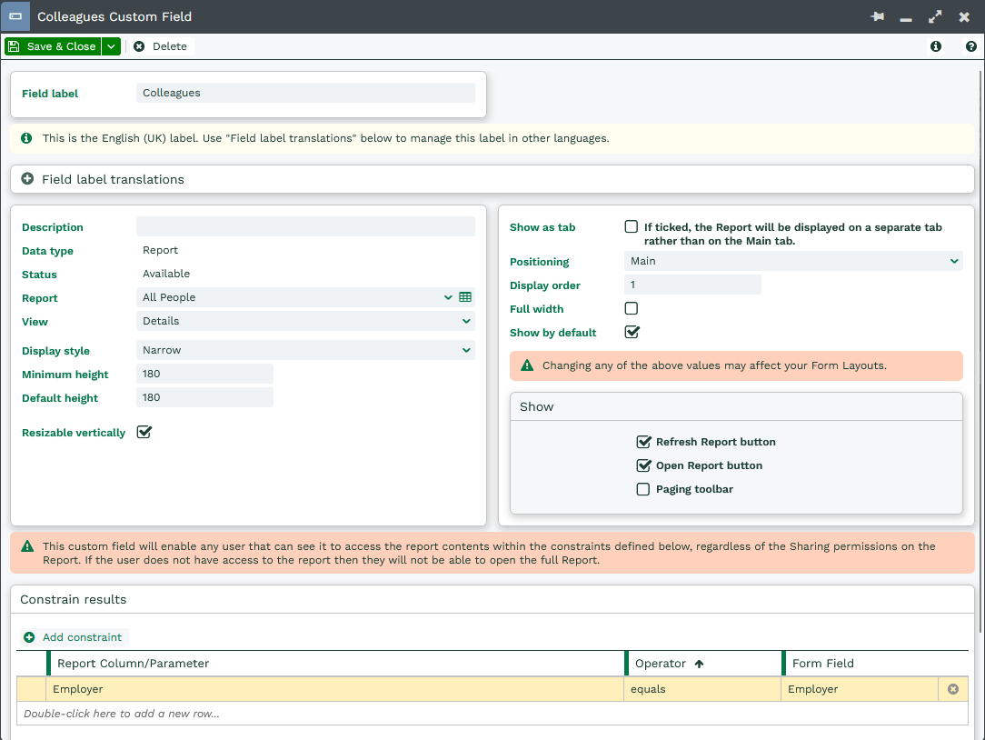 Each time you open or save a record, the data will automatically refresh so that it is displaying the most up-to-date information from the report at the time. You are also able to select to display a Refresh button and/or an Open Report button within the Custom Field configuration View.