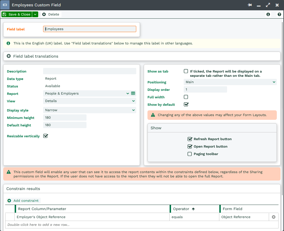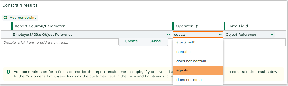 To filter down to the People that are linked to this Organisation as their employer, we have mapped the Form Field “Object Reference” to the Report Column “Employer’s Object Reference”. The operator in this scenario is ‘equals’, but it is possible to use other operators like ‘greater than’ or ‘contains’.