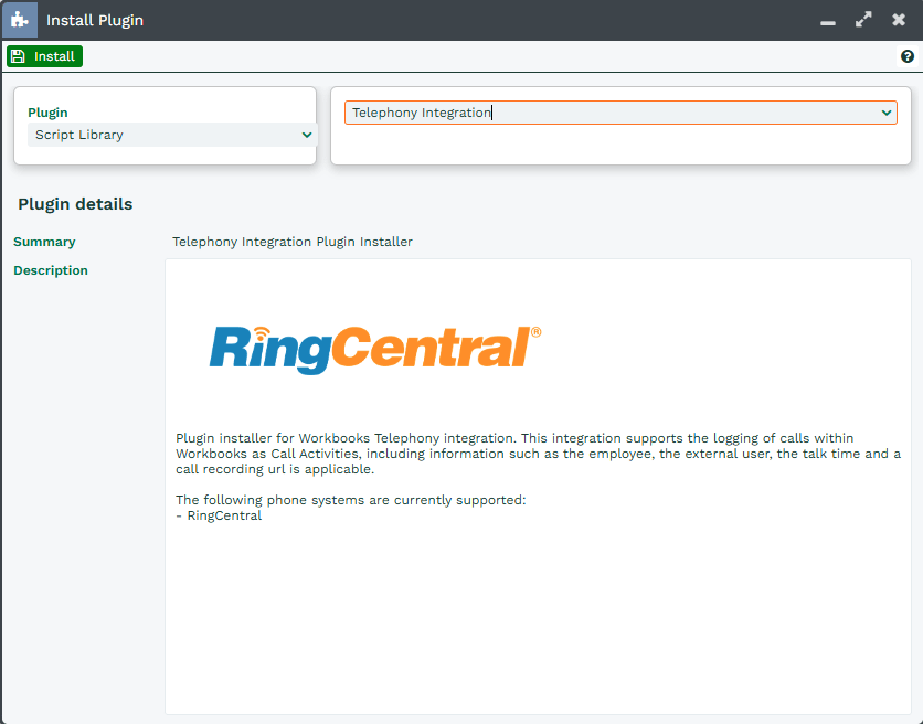 To set up the integration, install the Telephony Integration Plugin into your Workbooks database. The integration can only be done by the System Admin.