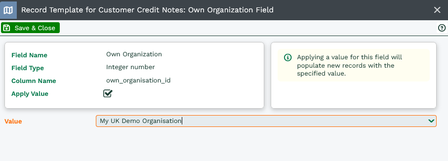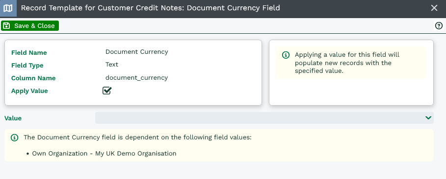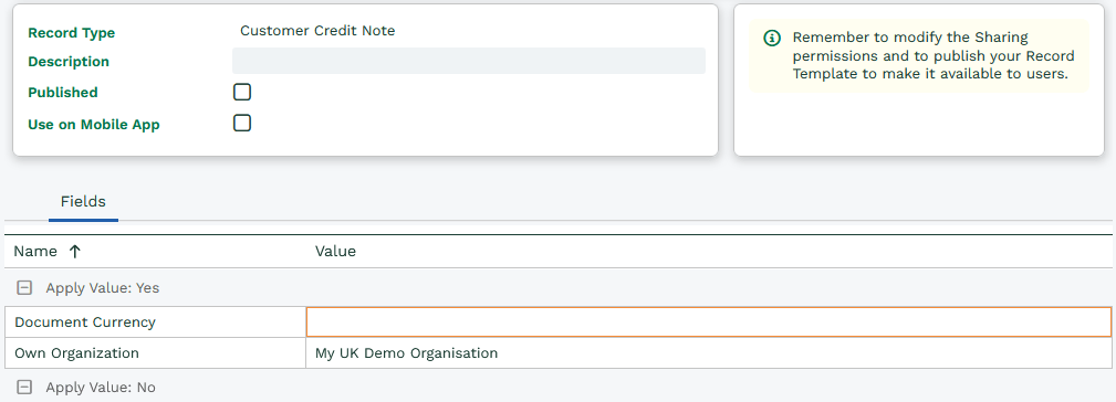 Within the new Record Template you will need to set the ‘Own Organisation’ field to your Organisation, as well as the Document Currency value to blank. Finally enable the Published checkbox and Save & Close.