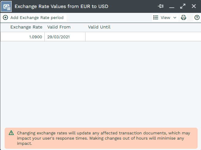 To add a new rate, click ‘Add Exchange Rate‘ period and enter your rate and a Valid From date.