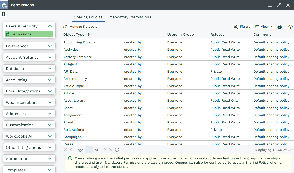 Sharing Policies combine with Mandatory Permissions to determine the overall permissions of an object when it’s first created. By default, Workbooks is supplied with one Sharing Policy for each object type, but a System Administrator can create more if required.