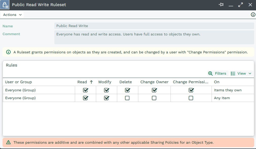 Whilst the majority of records are supplied with a Public Read Write Ruleset, some are supplied with a Private Ruleset. When this is combined with the standard Mandatory Permissions it means that users can read, modify, delete, change owner and change permissions on records they own but they cannot even read records that they don’t own.