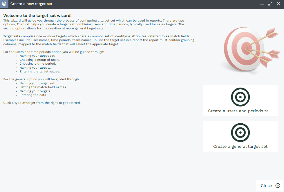 Navigate to Start > Reporting > New Target Wizard from the Landing Page menu, then choose ‘Create a general target’ and enter a suitable name for your new Target set, e.g. Closed Cases per month.