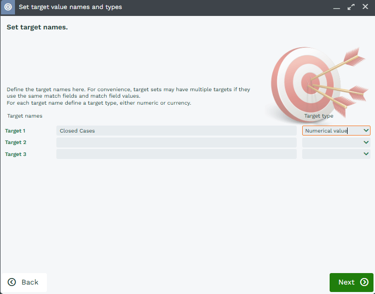 Here you must name the Target(s) and assign them a Target type, e.g. is the target financial (£GBP, $USD etc.), or a numerical (number of phone calls answered, cases closed etc.).