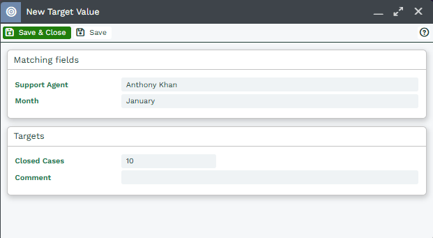 In this case, we are creating a Target set for your Support Team, giving each member a closed Cases value target per month, so our match fields will be ‘Support Agent’ and ‘Month’.